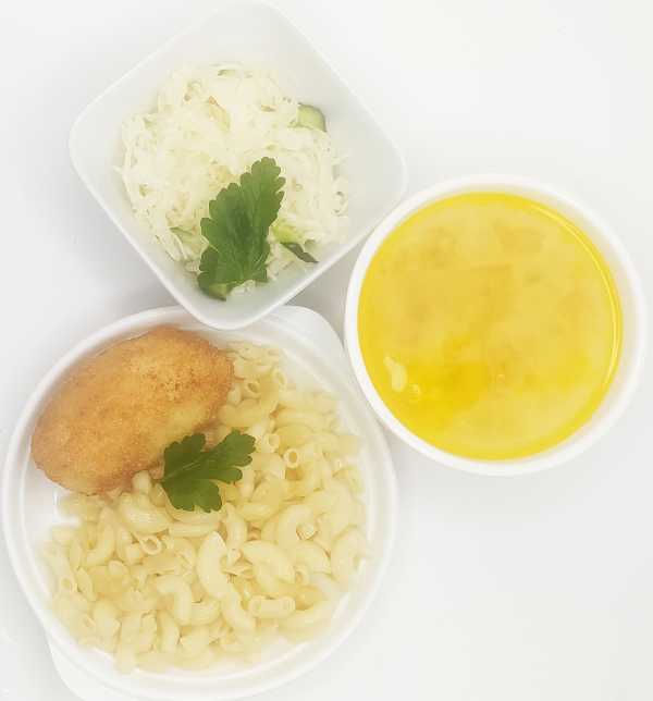 Суп-пюре Овощной, котлета куриная по-домашнему, макароны отварные, салат"Морковь с творогом", хлеб